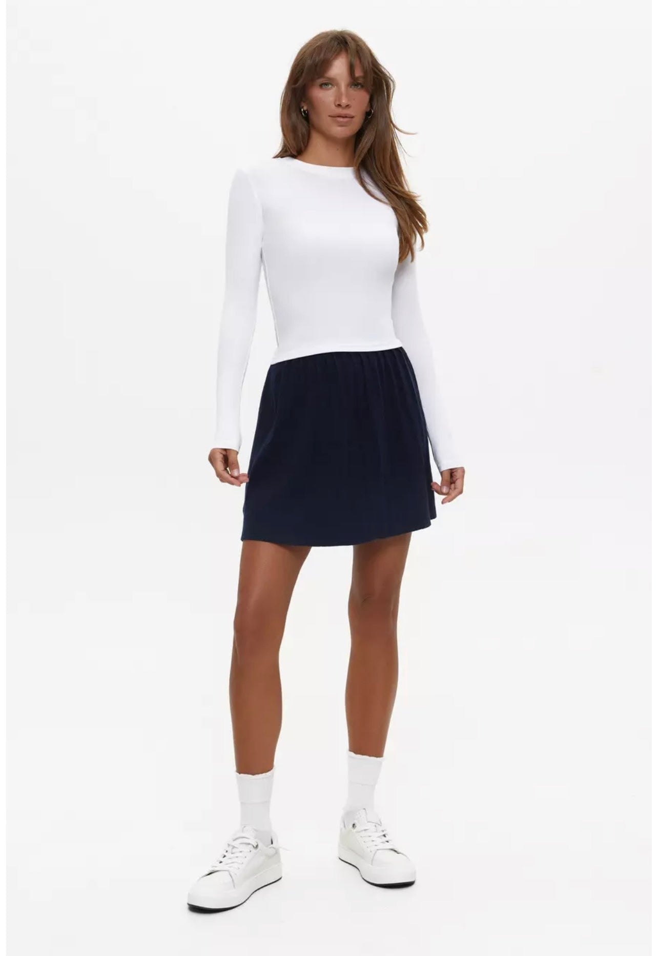 A sleek everyday essential with a polished finish. This white round-neck full-sleeve T-shirt features a smooth, body-skimming fit that enhances the silhouette without feeling restrictive. Crafted from a soft, stretchable polyamide-elastane blend, it offers all-day comfort with a refined, second-skin feel. Perfect for layering under skirts, trousers, or jackets or wearing solo for a clean, minimal look.